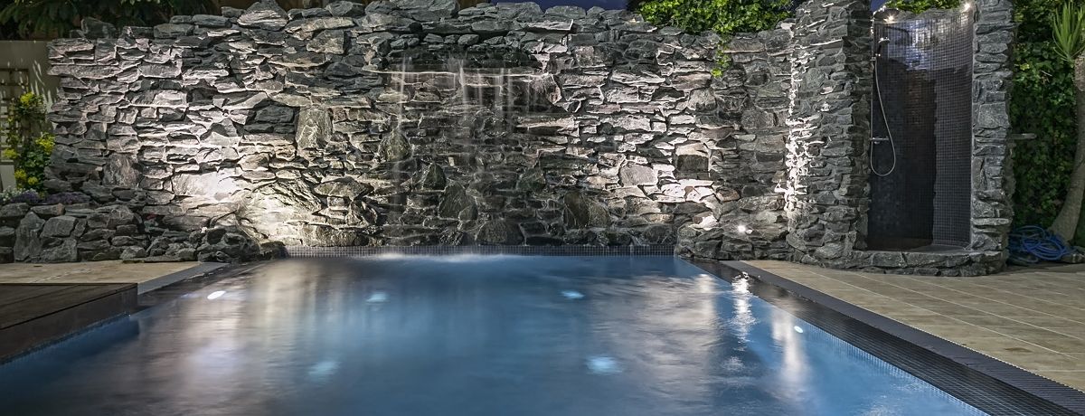 Ein beheizbarer - mit schwarz-blauem Mosaik beschichteter Pool mit Gegenstromanlage und eine Natursteinwand mit Wasserfall und Dusche.