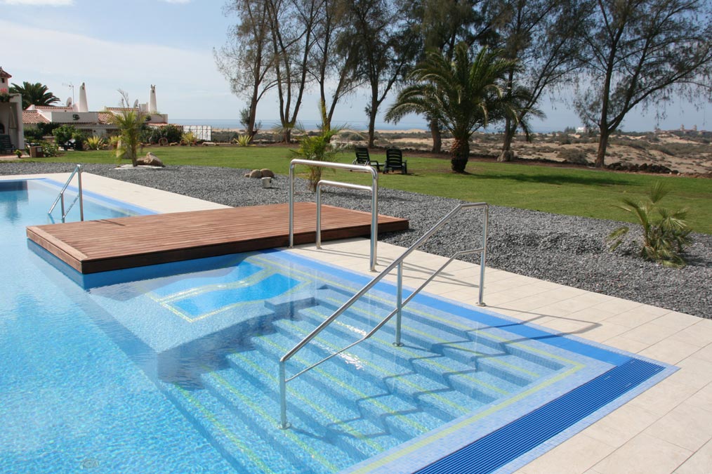Herstellung eines grossen Gemeinschaftspools in einer Bungalowanlage in Playa del Inglés mit grosszügigen Treppen, Sprudelliegen und Holzdeck.
