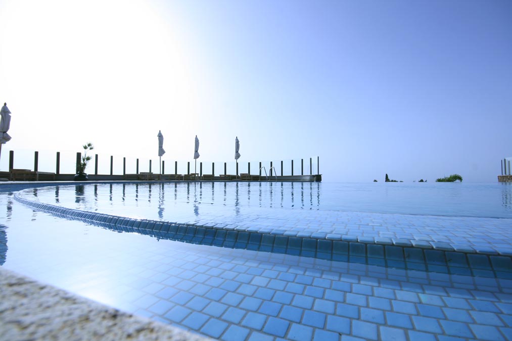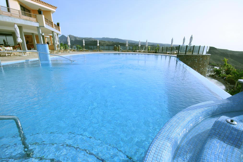 Die teilweise abgehängte Überlaufrinne bietet beim Schwimmen eine traumhafte Aussicht in die Schlucht und über die Berge. Der Whirlpool ist dabei so in den Pool integriert, dass er den perfekten Platz bietet, um das Bergpanorama zu geniessen.
